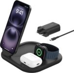 Allows simultaneous charging of iPhone (15W), AirPods (5W), and Apple Watch (3W) with MagSafe compatibility and built-in adjustable stand.